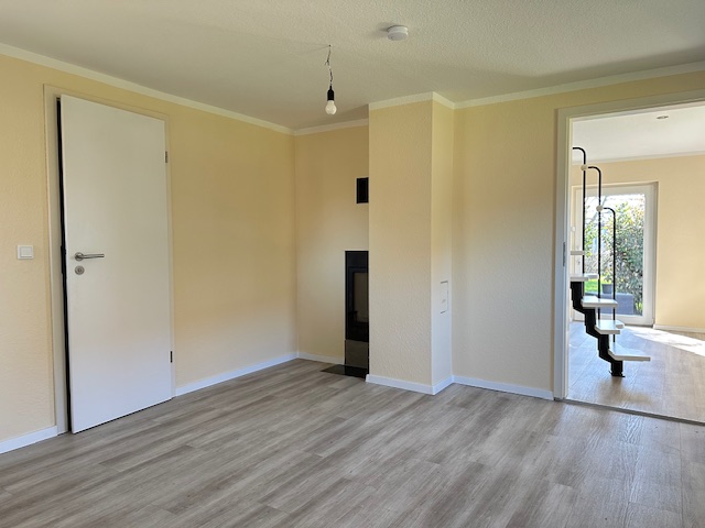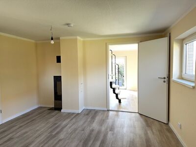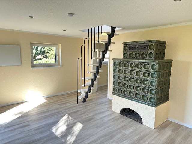 ein gemütliches Wohnzimmer mit Kaminofen und Zugang zur Terrasse, ein Duschbad, einen Vorraum zur Einrichtung einer kleinen Küche sowie einen zusätzlichen Studioraum im Dachgeschoss, erreichbar über eine Raumspartreppe